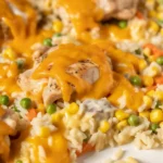 - In a baking dish, combine cooked rice, shredded chicken, frozen vegetables, cream of chicken soup, garlic powder, salt, and pepper.